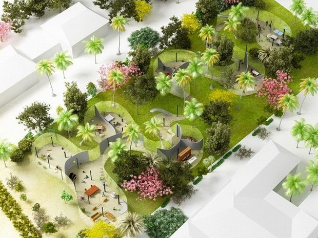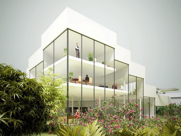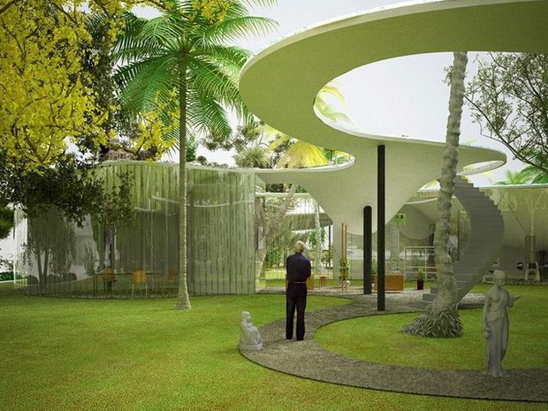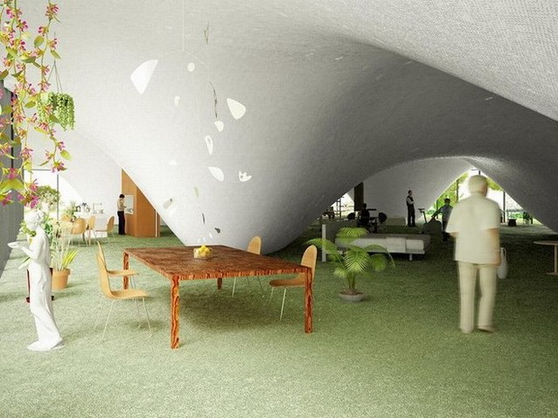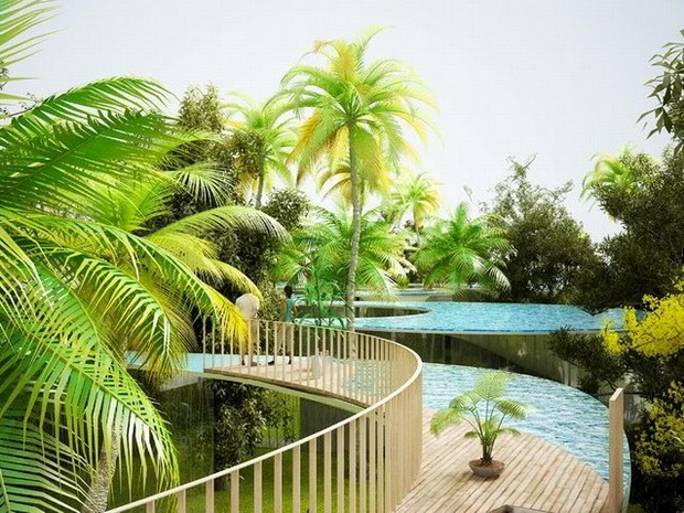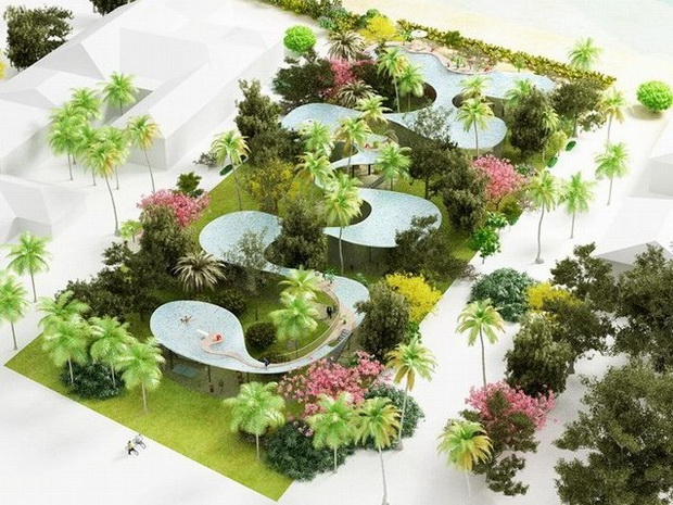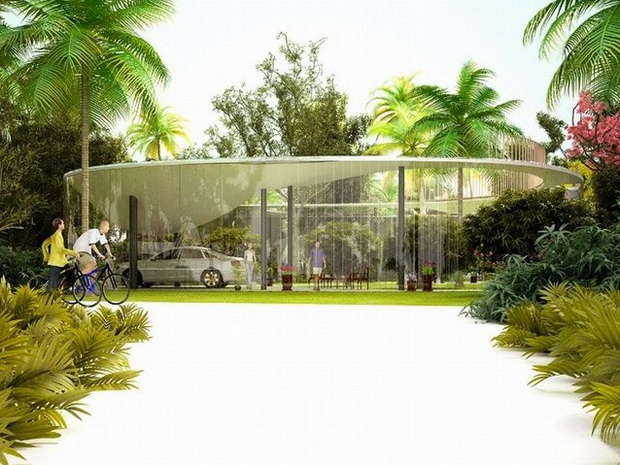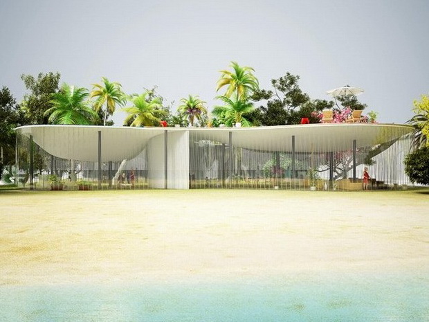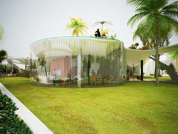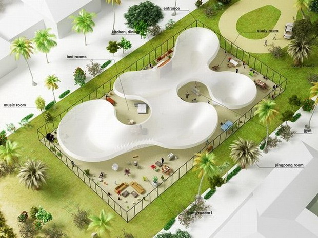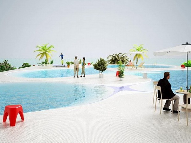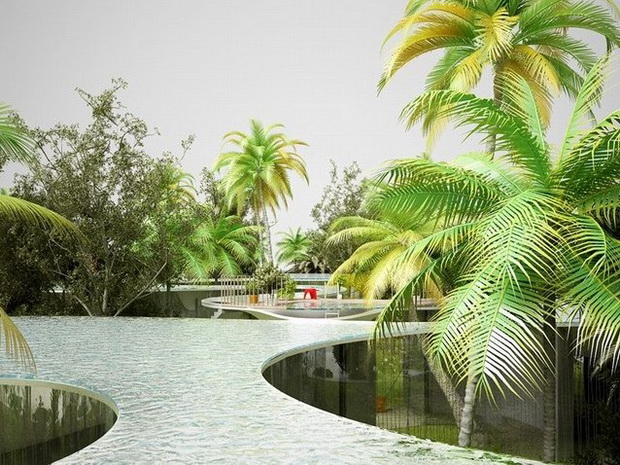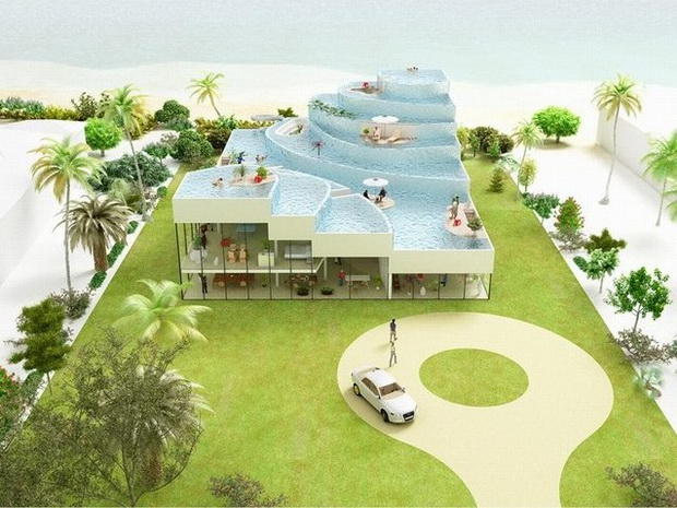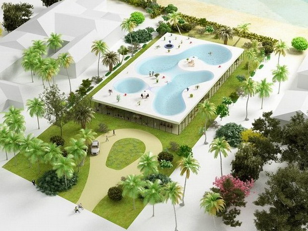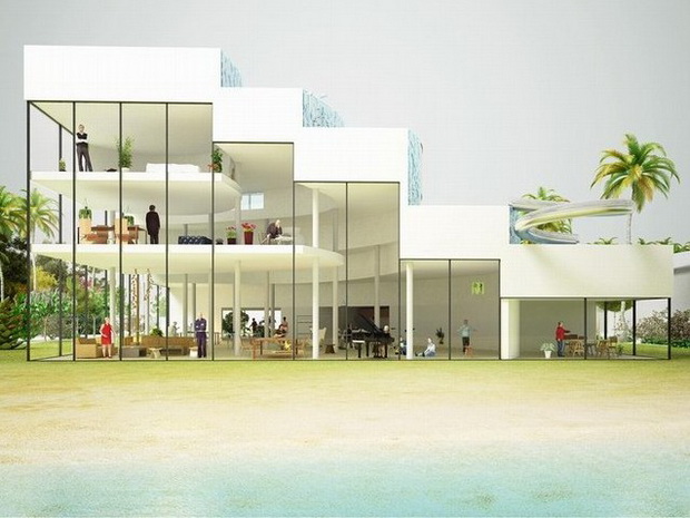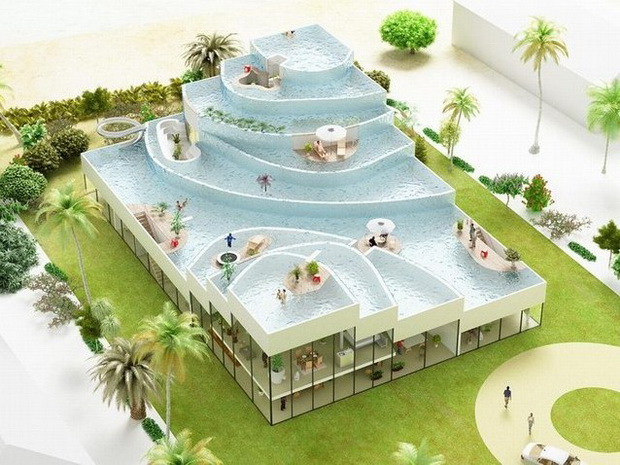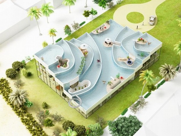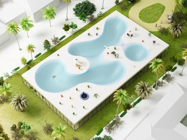 來自荷蘭的NLarchitects建筑事務所總能為我們帶來不一樣的新奇想法,很快他們設想了三個方案。都是將泳池架設在住宅的屋頂,房子的生活區(qū)位于泳池下面,以通透的玻璃幕墻圍合。通過泳池的不同形狀與深度劃分出下面的空間,上面的泳池儼然成為一個水上樂園!